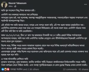 এই পরিপ্রেক্ষিতে, নূসরাত তাবাসসুম প্রাথমিকভাবে নির্বাচনকালীন সময়ে পার্টির সকল কার্যক্রম থেকে নিজেকে নিষ্ক্রিয় করেছেন এবং অবস্থা পুনর্বিবেচনা সাপেক্ষে যেকোনো চূড়ান্ত সিদ্ধান্ত নেয়ার ঘোষণা দিয়েছেন।